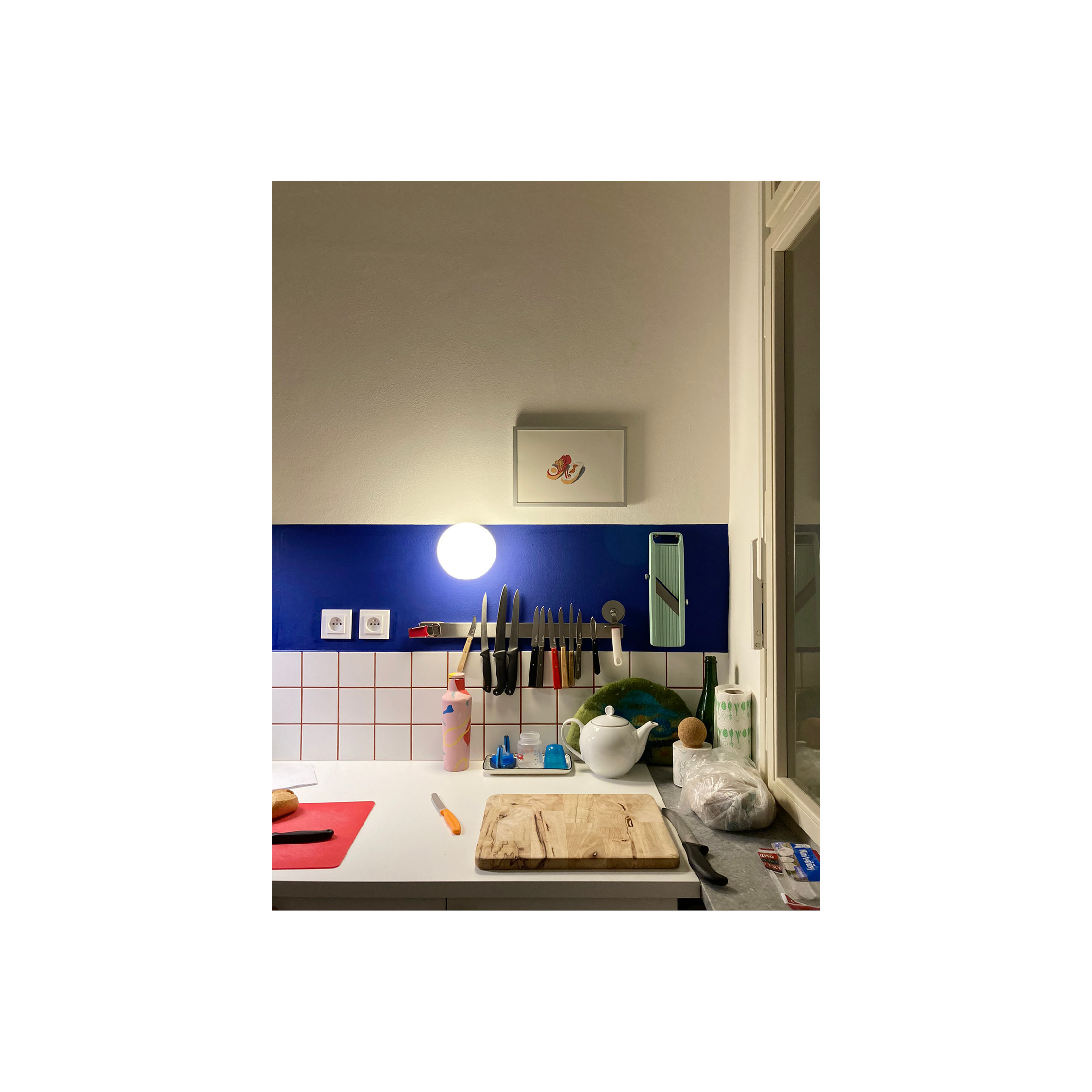 The apartment is really lived in! It's filled with lots of fun and beautiful things. The built-in wardrobes are actually just doors in new niches - inside there's an upper shelf, IKEA storage systems, and blue or green.