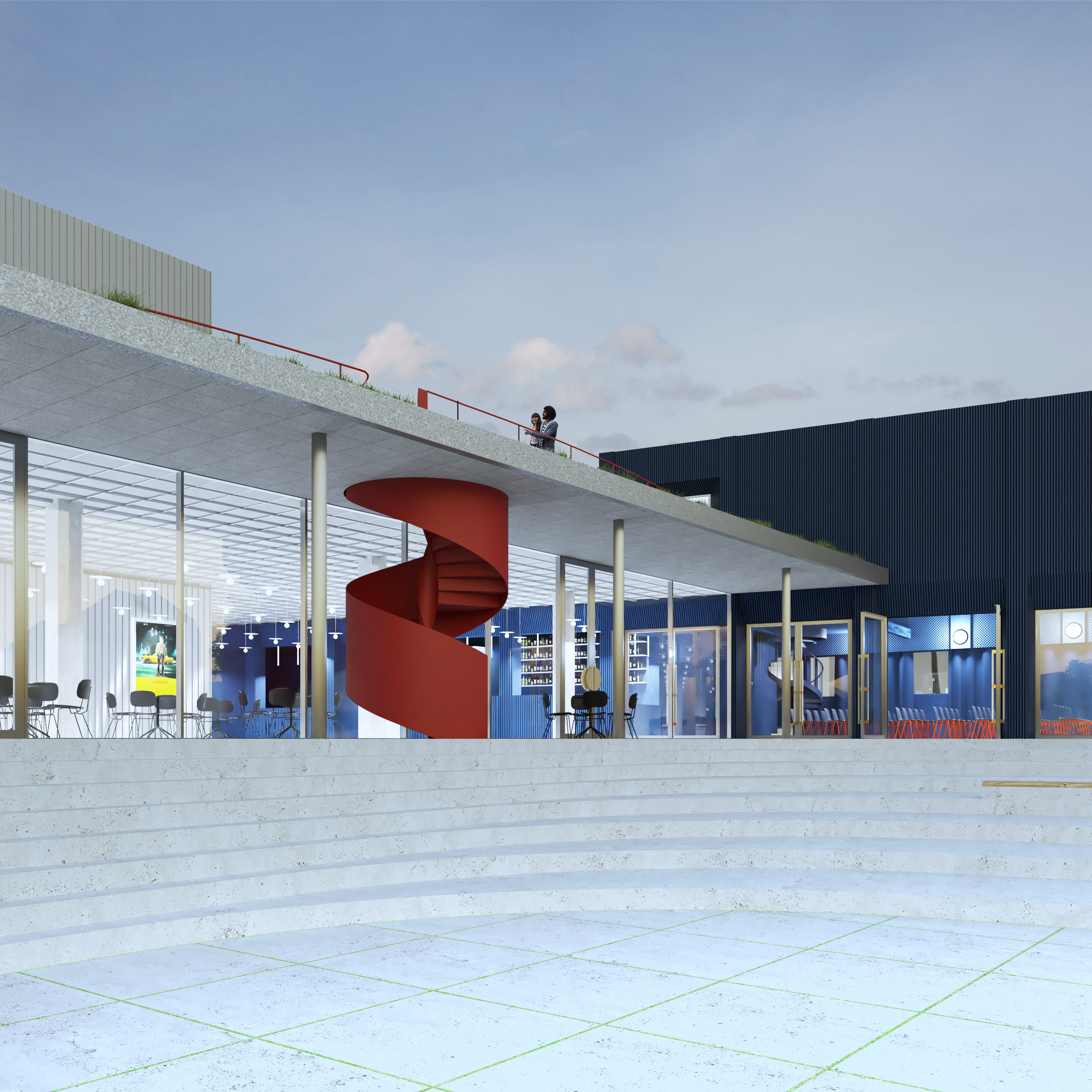 Přístup ke kinu je dnes nejasný, předprostor nemá využití a chybí malý společenský sál. Navrhujeme jeho přístavbu směrem k autobusovému nádraží. Nová budova vítá návštěvníky, spolu s původním objektem vytváří náruč kultivovaného veřejného prostoru s venkovním hledištěm. Střecha kina je přístupná, vzniká zde další prostor pro kulturu.