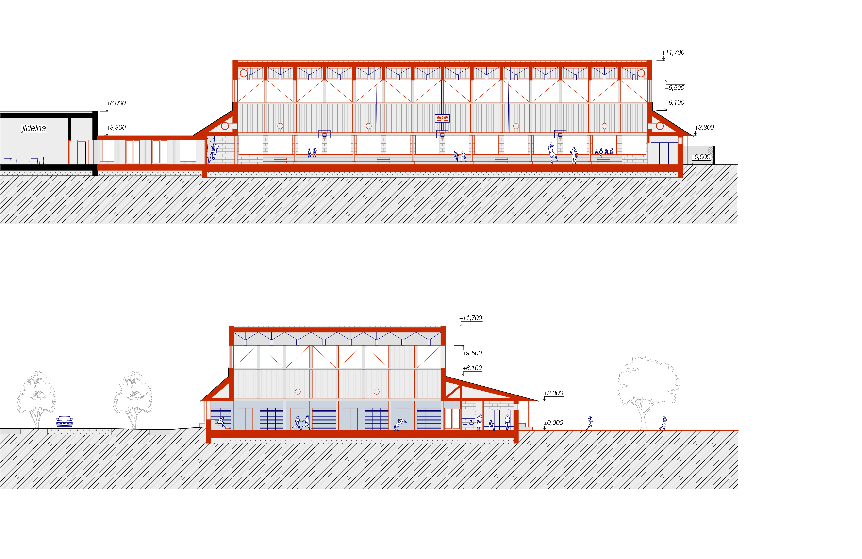 Novou budovu tělocvičny navazujeme na řád školního areálu. Hala doplňuje uliční čáru a vymezuje volný prostor zahrady otevírající se směrem k řece. Výrazná silueta střechy spolu s hravou sportovní barevností oživují monotónní výraz školy.
